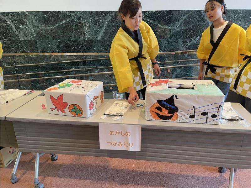 お菓子のつかみ取りコーナーを担当したともみ先生(左)と夏子先生(右)です。