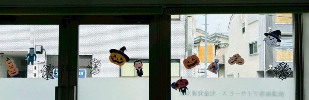 10月の初めから壁やガラスに貼り、子供も興味をもって見ていたりしていました。